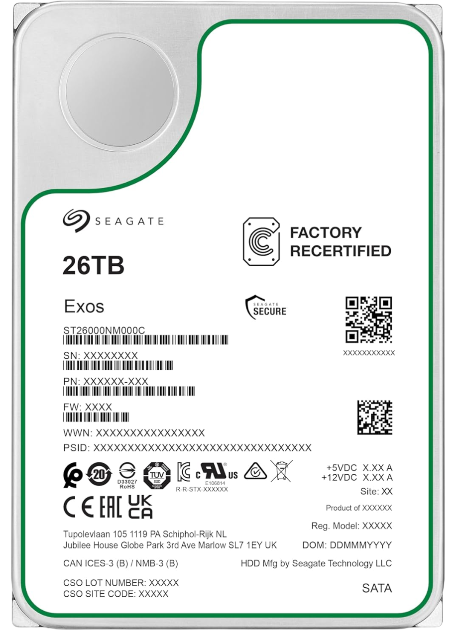 Скорость вращения шпинделя 7200 об/мин. Оснащен буферной памятью 512 МБ для плавной работы с большими потоками данных. Seagate Exos X26 cоздан для работы 24/7 в условиях постоянной нагрузки. Имеет высокий показатель надежности — 2.5 миллиона часов наработки на отказ (MTBF).